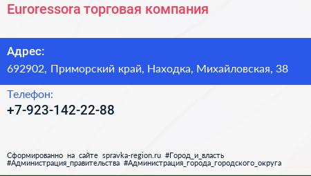 Euroressora, торговая компания по адресу 692902, Приморский край, Находка, Михайловская, 38 в дальнейшем Организация, размещена в следующих категориях: