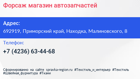 Форсаж, магазин автозапчастей по адресу 692919, Приморский край, Находка, Малиновского, 8 в дальнейшем Организация, размещена в следующих категориях: