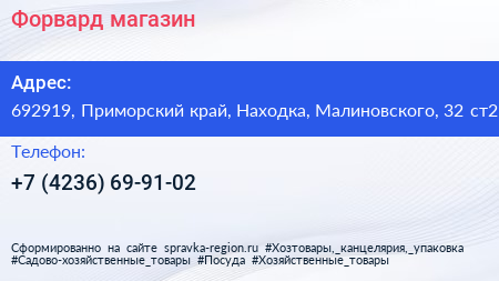 Форвард, магазин по адресу 692919, Приморский край, Находка, Малиновского, 32 ст2 в дальнейшем Организация, размещена в следующих категориях: