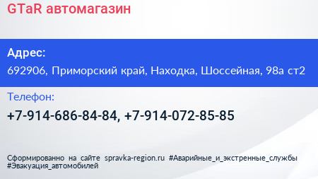 GTaR, автомагазин по адресу 692906, Приморский край, Находка, Шоссейная, 98а ст2 в дальнейшем Организация, размещена в следующих категориях:
