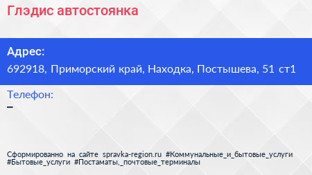 Глэдис, автостоянка по адресу 692918, Приморский край, Находка, Постышева, 51 ст1 в дальнейшем Организация, размещена в следующих категориях: