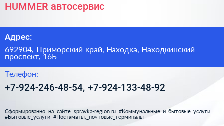 HUMMER, автосервис по адресу 692904, Приморский край, Находка, Находкинский проспект, 16Б в дальнейшем Организация, размещена в следующих категориях: