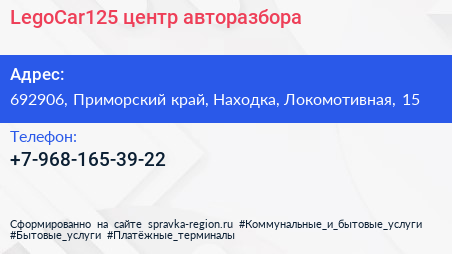 LegoCar125, центр авторазбора по адресу 692906, Приморский край, Находка, Локомотивная, 15 в дальнейшем Организация, размещена в следующих категориях: