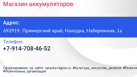 Магазин аккумуляторов по адресу 692919, Приморский край, Находка, Набережная, 1а в дальнейшем Организация, размещена в следующих категориях: