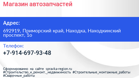 Магазин автозапчастей по адресу 692919, Приморский край, Находка, Находкинский проспект, 1о в дальнейшем Организация, размещена в следующих категориях: