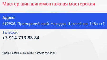 Мастер шин, шиномонтажная мастерская по адресу 692906, Приморский край, Находка, Шоссейная, 148а ст1 в дальнейшем Организация, размещена в следующих категориях: