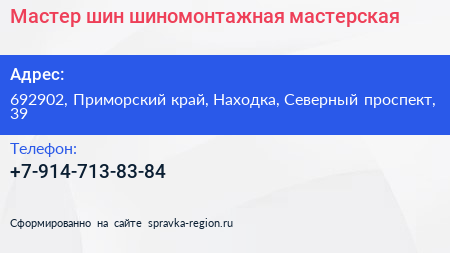 Мастер шин, шиномонтажная мастерская по адресу 692902, Приморский край, Находка, Северный проспект, 39 в дальнейшем Организация, размещена в следующих категориях: