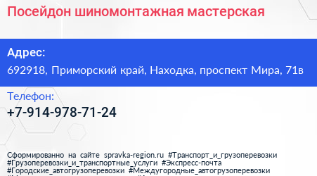 Посейдон, шиномонтажная мастерская по адресу 692918, Приморский край, Находка, проспект Мира, 71в в дальнейшем Организация, размещена в следующих категориях: