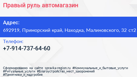 Правый руль, автомагазин по адресу 692919, Приморский край, Находка, Малиновского, 32 ст2 в дальнейшем Организация, размещена в следующих категориях: