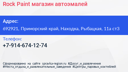 Rock Paint, магазин автоэмалей по адресу 692921, Приморский край, Находка, Рыбацкая, 11а ст3 в дальнейшем Организация, размещена в следующих категориях:
