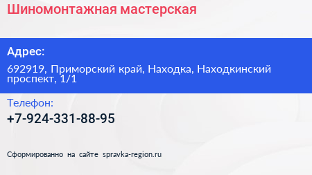 Шиномонтажная мастерская по адресу 692919, Приморский край, Находка, Находкинский проспект, 1/1 в дальнейшем Организация, размещена в следующих категориях: