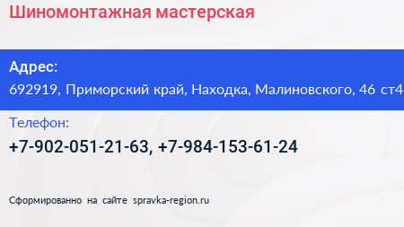 Шиномонтажная мастерская по адресу 692919, Приморский край, Находка, Малиновского, 46 ст4 в дальнейшем Организация, размещена в следующих категориях: