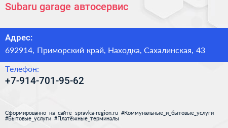 Subaru garage, автосервис по адресу 692914, Приморский край, Находка, Сахалинская, 43 в дальнейшем Организация, размещена в следующих категориях: