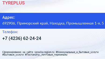 TYREPLUS по адресу 692906, Приморский край, Находка, Промышленная 1-я, 5 в дальнейшем Организация, размещена в следующих категориях: