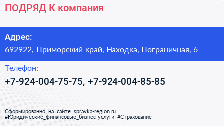 ПОДРЯД-К, компания по адресу 692922, Приморский край, Находка, Пограничная, 6 в дальнейшем Организация, размещена в следующих категориях: