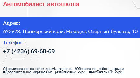 Автомобилист, автошкола по адресу 692928, Приморский край, Находка, Озёрный бульвар, 10 в дальнейшем Организация, размещена в следующих категориях:
