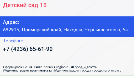 Детский сад №15 по адресу 692916, Приморский край, Находка, Чернышевского, 5а в дальнейшем Организация, размещена в следующих категориях: