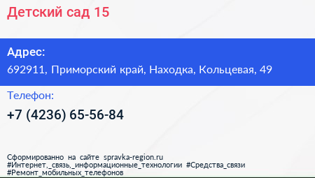 Детский сад №15 по адресу 692911, Приморский край, Находка, Кольцевая, 49 в дальнейшем Организация, размещена в следующих категориях: