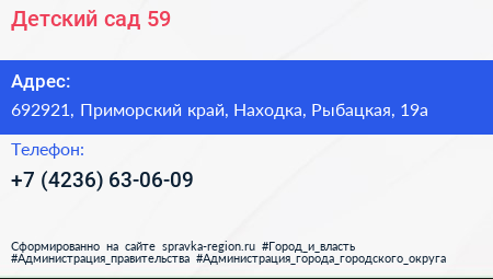 Детский сад №59 по адресу 692921, Приморский край, Находка, Рыбацкая, 19а в дальнейшем Организация, размещена в следующих категориях:
