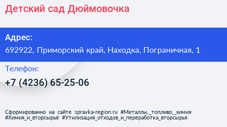 Детский сад Дюймовочка по адресу 692922, Приморский край, Находка, Пограничная, 1 в дальнейшем Организация, размещена в следующих категориях: