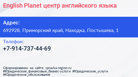 English Planet, центр английского языка по адресу 692928, Приморский край, Находка, Постышева, 1 в дальнейшем Организация, размещена в следующих категориях: