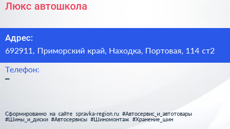 Люкс, автошкола по адресу 692911, Приморский край, Находка, Портовая, 114 ст2 в дальнейшем Организация, размещена в следующих категориях: