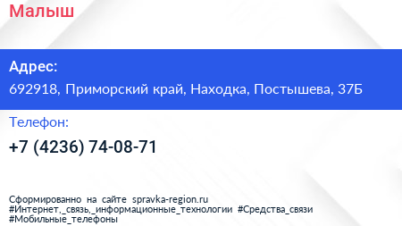 Малыш по адресу 692918, Приморский край, Находка, Постышева, 37Б в дальнейшем Организация, размещена в следующих категориях: