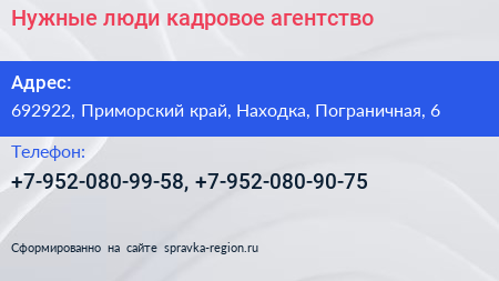 Нужные люди, кадровое агентство по адресу 692922, Приморский край, Находка, Пограничная, 6 в дальнейшем Организация, размещена в следующих категориях: