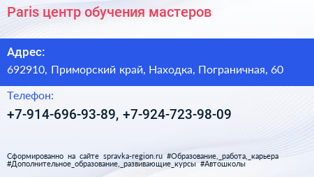 Paris, центр обучения мастеров по адресу 692910, Приморский край, Находка, Пограничная, 60 в дальнейшем Организация, размещена в следующих категориях: