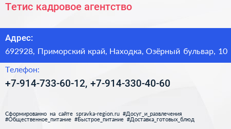 Тетис, кадровое агентство по адресу 692928, Приморский край, Находка, Озёрный бульвар, 10 в дальнейшем Организация, размещена в следующих категориях: