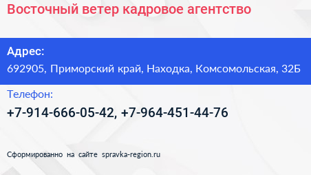Восточный ветер, кадровое агентство по адресу 692905, Приморский край, Находка, Комсомольская, 32Б в дальнейшем Организация, размещена в следующих категориях: