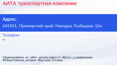 АИТА, транспортная компания по адресу 692921, Приморский край, Находка, Рыбацкая, 12а в дальнейшем Организация, размещена в следующих категориях: