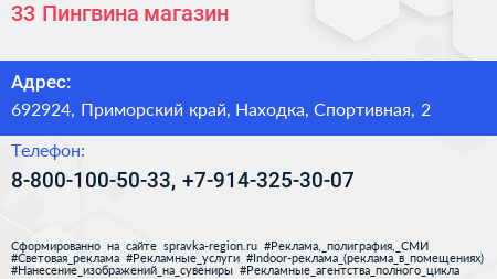 33 Пингвина, магазин по адресу 692924, Приморский край, Находка, Спортивная, 2 в дальнейшем Организация, размещена в следующих категориях: