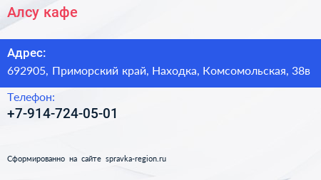 Алсу, кафе по адресу 692905, Приморский край, Находка, Комсомольская, 38в в дальнейшем Организация, размещена в следующих категориях: