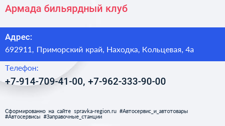 Армада, бильярдный клуб по адресу 692911, Приморский край, Находка, Кольцевая, 4а в дальнейшем Организация, размещена в следующих категориях: