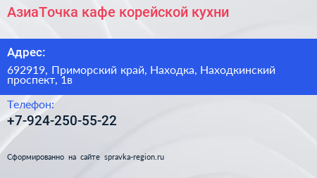АзиаТочка, кафе корейской кухни по адресу 692919, Приморский край, Находка, Находкинский проспект, 1в в дальнейшем Организация, размещена в следующих категориях: