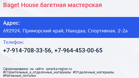 Baget House, багетная мастерская по адресу 692924, Приморский край, Находка, Спортивная, 2-2а в дальнейшем Организация, размещена в следующих категориях:
