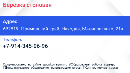 Берёзка, столовая по адресу 692919, Приморский край, Находка, Малиновского, 21а в дальнейшем Организация, размещена в следующих категориях: