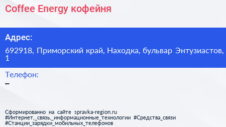 Coffee & Energy, кофейня по адресу 692918, Приморский край, Находка, бульвар Энтузиастов, 1 в дальнейшем Организация, размещена в следующих категориях: