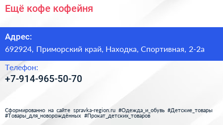 Ещё кофе, кофейня по адресу 692924, Приморский край, Находка, Спортивная, 2-2а в дальнейшем Организация, размещена в следующих категориях: