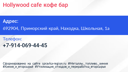 Hollywood cafe, кофе-бар по адресу 692904, Приморский край, Находка, Школьная, 1а в дальнейшем Организация, размещена в следующих категориях: