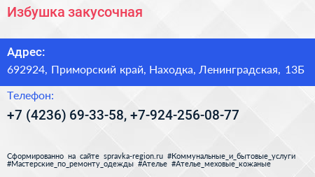 Избушка, закусочная по адресу 692924, Приморский край, Находка, Ленинградская, 13Б в дальнейшем Организация, размещена в следующих категориях: