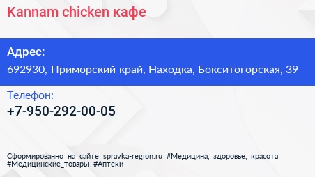 Kannam chicken, кафе по адресу 692930, Приморский край, Находка, Бокситогорская, 39 в дальнейшем Организация, размещена в следующих категориях:
