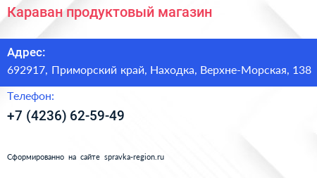 Караван, продуктовый магазин по адресу 692917, Приморский край, Находка, Верхне-Морская, 138 в дальнейшем Организация, размещена в следующих категориях: