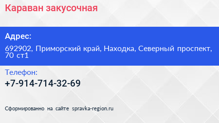 Караван, закусочная по адресу 692902, Приморский край, Находка, Северный проспект, 70 ст1 в дальнейшем Организация, размещена в следующих категориях: