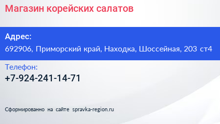 Магазин корейских салатов по адресу 692906, Приморский край, Находка, Шоссейная, 203 ст4 в дальнейшем Организация, размещена в следующих категориях:
