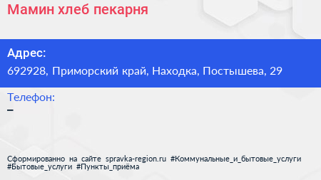 Мамин хлеб, пекарня по адресу 692928, Приморский край, Находка, Постышева, 29 в дальнейшем Организация, размещена в следующих категориях: