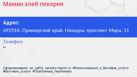 Мамин хлеб, пекарня по адресу 692918, Приморский край, Находка, проспект Мира, 51 в дальнейшем Организация, размещена в следующих категориях: