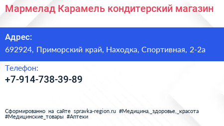 Мармелад & Карамель, кондитерский магазин по адресу 692924, Приморский край, Находка, Спортивная, 2-2а в дальнейшем Организация, размещена в следующих категориях: