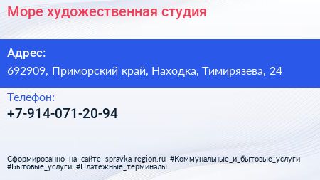Море, художественная студия по адресу 692909, Приморский край, Находка, Тимирязева, 24 в дальнейшем Организация, размещена в следующих категориях: